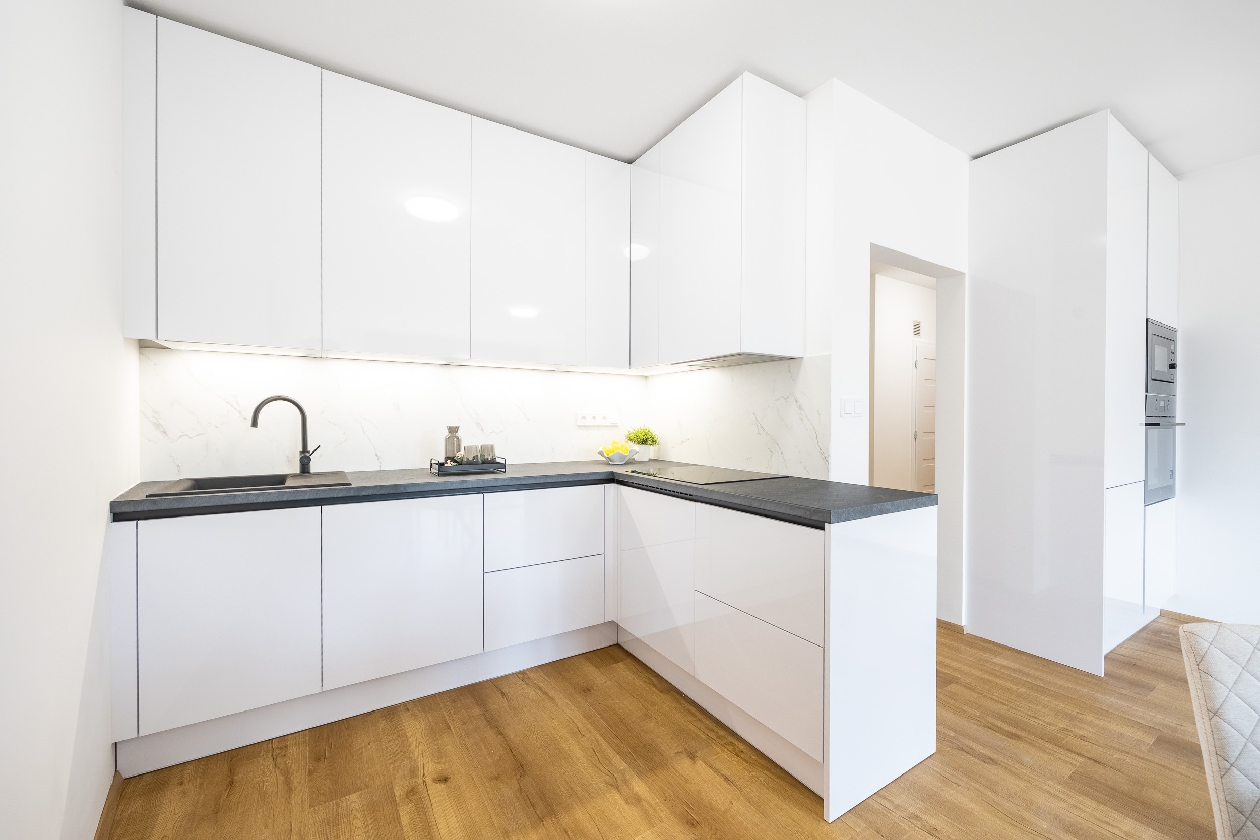 – nová kuchyňská linka vyrobena na míru se spotřebiči (Electrolux elektrická trouba, myčka, indukční deska, mikrovlná trouba, digestoř, LED osvětlení, dřez s odkapávačem)