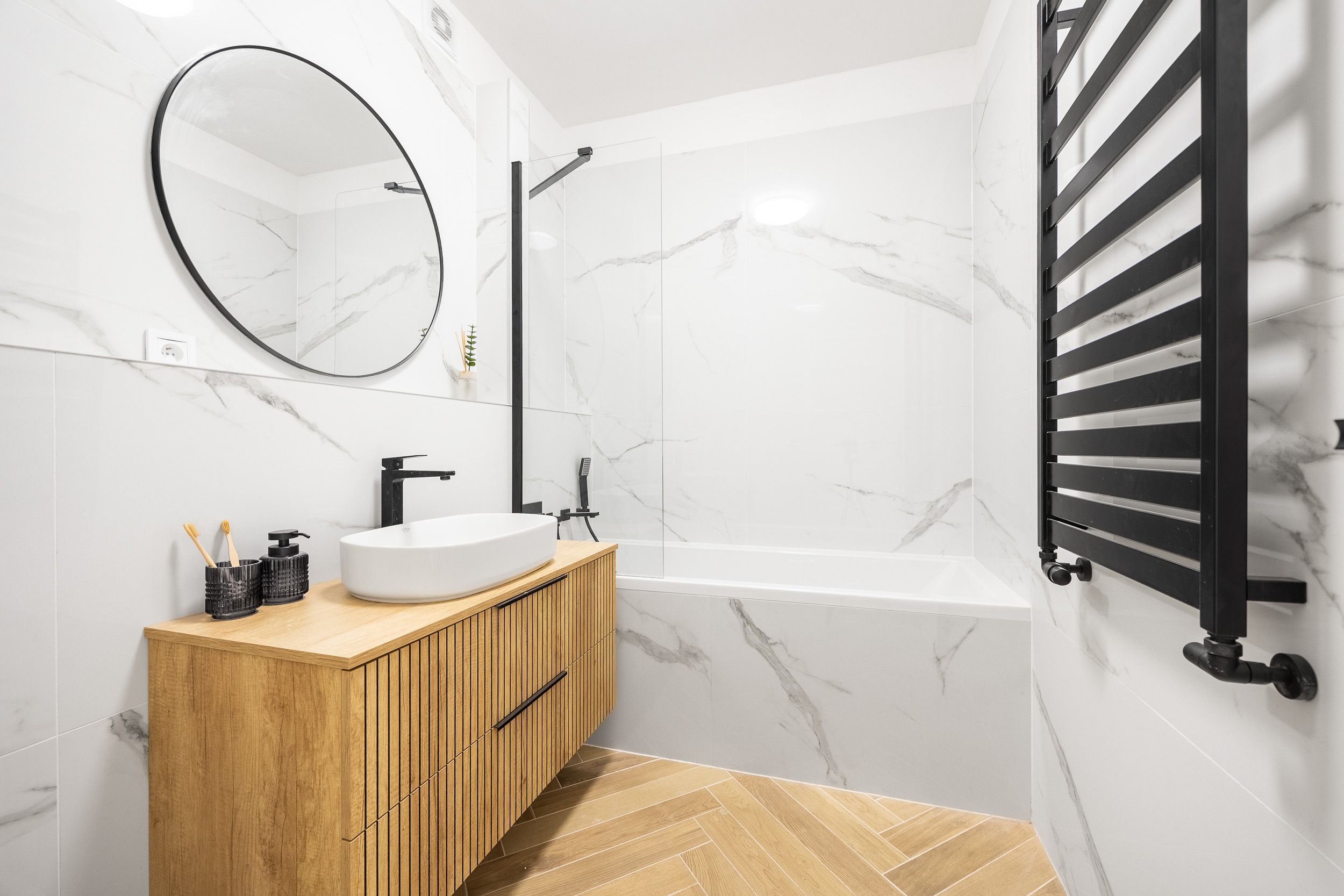 – nová sanita (vana, skleněná zástěna, umyvadlo, skříňka, zrcadlo, toaleta, bidetová sprcha)